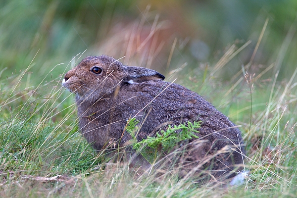 Mountain Hare sitting in grasses,in the rain. Sept. '11.