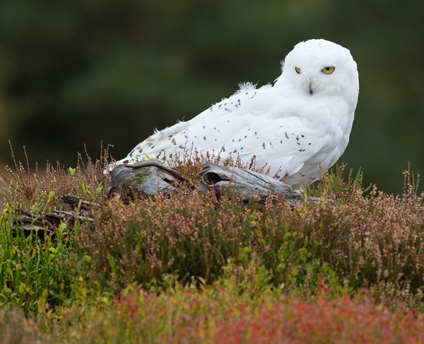 | Snowy Owl on stump in heather 3. Oct. '13.