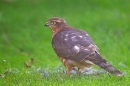 Male Sparrowhawk with sparrow prey on garden fence 2. Jun. '23.