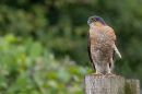 Male Sparrowhawk with loose feather on garden fence. Jun. '23.