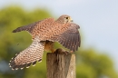 Fem.Kestrel on post,open winged,with prey 1. Sept. '16.