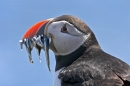 Puffin with sandeels,close up.Jul '10.
